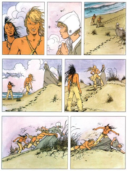 XVIII wiek, mała osada europejska na wybrzeżu Ameryki Północnej. Młoda kolonistka zostaje zgwałcona przez dwóch Indian, co staje się zarzewiem krwawego konfliktu z miejscowym plemieniem... Znakomicie ukazane stosunki nie tylko między Europejczykami a Indianami, ale także pomiędzy samymi, wcale nieprzepadającymi za sobą, kolonistami. Scenariusz został tak wymyślony, aby dać spore pole do popisu Milo Manarze, który uwielbia rysować sceny erotyczne.