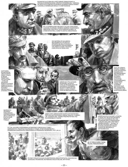 Pod wspólną, symboliczną nazwą Katyń w komiksie połączone zostały opowieści o losach wszystkich pomordowanych jeńców z obozów w Kozielsku, Ostaszkowie i Starobielsku. Wszak ich losy jednoczy nie tylko bestialski mord, ale także zdrada najeźdźcy, wspólne uwięzienie w byłych monastyrach oraz żywione do końca nadzieje, że zostaną przekazani państwom neutralnym, uwolnieni bądź odesłani z powrotem do domów.