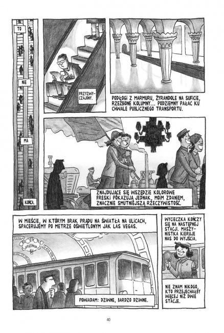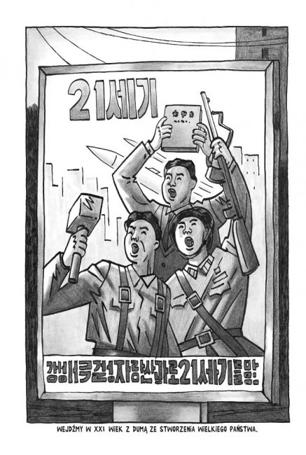 Delisle porusza się oczywiście po Pjongjangu ściśle wyznaczonymi trasami. Każdy jego krok jest uważnie obserwowany przez "towarzysza tłumacza", "towarzysza przewodnika" oraz rozbudowany aparat bezpieczeństwa. W Korei Północnej Wielki Brat cały czas patrzy. Autor komiksu to jednak bystry i uważny obserwator, któremu udaje się przedstawić czytelnikowi zaskakujący obraz państwa należącego do "osi zła". Kraju ciągłych absurdów i paradoksów, z których wiele swoją komicznością przypomina sytuacje z filmów Barei, ale także terroru i opresji, które z kolei przywołują mroczną epokę stalinowską.