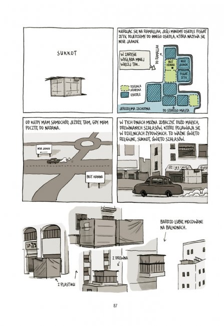 Najnowszy komiks Guya Delisle'a ("Pjongjang", "Kroniki birmańskie") opowiada o czasie jaki autor spędził z rodziną w Jerozolimie i okolicach Świętego Miasta. Z właściwą sobie spostrzegawczością, poczuciem humoru i dystansem do siebie opisuje on spotkania z Żydami, Palestyńczykami, pracownikami organizacji humanitarnych z całego świata; przechodzenie przez punkty kontrolne pilnowane przez izraelską armię, wycieczki wzdłuż słynnego muru bezpieczeństwa, czy zwiedzanie miejsc najważniejszych dla judaizmu, chrześcijaństwa i islamu.